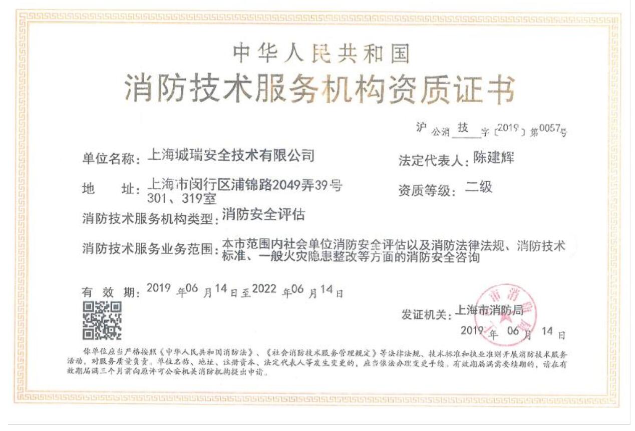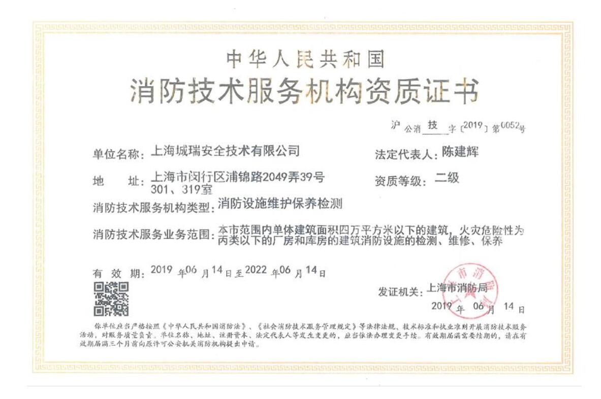 上海城瑞安全技術有限公司是具有中華人民共和國消防技術服務資質的建筑消防設施維護保養檢測資質和消防安全評估資質及電氣檢測資質的專業化公司,注冊資金人民幣3000萬元整,位于上海市閔行區浦錦路2049弄7號樓,公司專業從事城市智慧消防、微型消防站、消防設施維護保養、消防設施檢測、消防安全評估、電氣防火檢測、智能電務平臺、消防技術咨詢、消防工程安裝指導等消防技術服務。